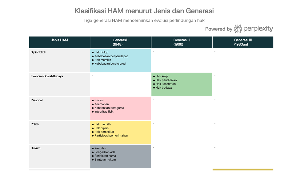 Klasifikasi ini mencerminkan evolusi pemahaman HAM dari generasi ke generasi, dengan pengakuan bahwa perlindungan HAM yang komprehensif memerlukan pendekatan holistik yang mengintegrasikan semua kategori tersebut.