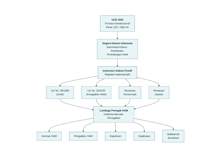 Komitmen suatu negara terhadap perlindungan Hak Asasi Manusia dapat diukur dari seberapa kuat fondasi hukum yang dibangun untuk menjaminnya. Indonesia, sebagai negara hukum yang secara tegas dinyatakan dalam Pasal 1 ayat (3) Undang-Undang Dasar 1945, memiliki tanggung jawab konstitusional untuk menyelenggarakan penghormatan, perlindungan, dan pemenuhan HAM bagi seluruh warganya tanpa diskriminasi[1]. Dalam perjalanan reformasi pasca-1998, Indonesia telah membentuk infrastruktur hukum yang komprehensif untuk melindungi HAM, termasuk Amandemen Kedua UUD 1945 yang secara eksplisit mengatur HAM dalam Bab XA (Pasal 28A–28J), Undang-Undang Nomor 39 Tahun 1999 tentang Hak Asasi Manusia, dan Undang-Undang Nomor 26 Tahun 2000 tentang Pengadilan Hak Asasi Manusia[2].